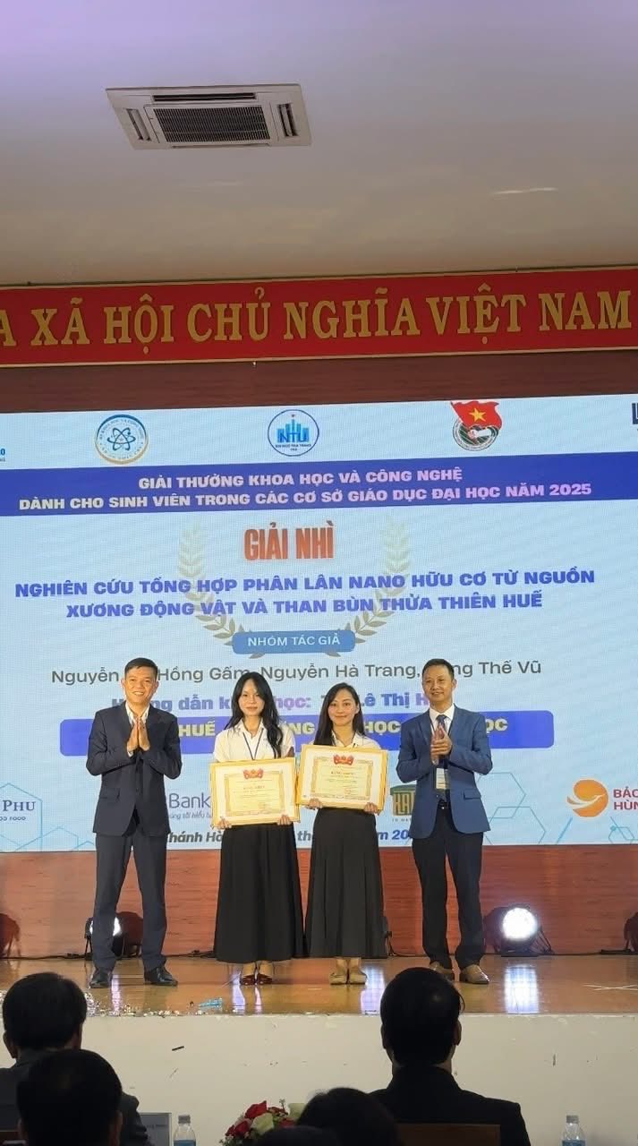 - Nhóm sinh viên gồm các em: Nguyễn Thị Hồng Gấm; Nguyễn Hà Trang; Đặng Thế Vũ, với tên Đề tài: “Nghiên cứu tổng hợp phân lân nano hữu cơ từ nguồn xương động vật và than bùn Thừa Thiên Huế”. Hướng nghiên cứu này tập trung vào việc tái sử dụng phụ phẩm tự nhiên để tạo ra vật liệu phân bón thân thiện với môi trường, góp phần thúc đẩy nông nghiệp bền vững và phát triển kinh tế tuần hoàn tại địa phương. Trong quá trình thực hiện, nhóm sinh viên nhận được sự hướng dẫn tận tình của cô Lê Thị Hòa – Giảng viên Khoa Hóa học. Thành công của đề tài là kết quả của sự nỗ lực, sáng tạo và tinh thần nghiêm túc trong nghiên cứu khoa học của cả cô và trò.