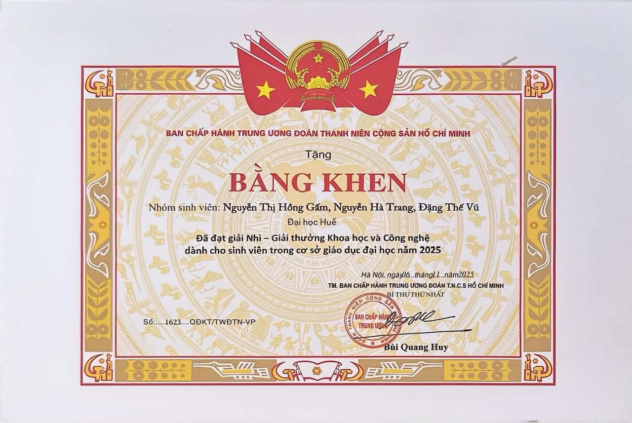 Vừa qua, tại Lễ trao Giải thưởng “Khoa học và Công nghệ dành cho sinh viên trong các cơ sở giáo dục đại học năm 2025” do Trung ương Đoàn TNCS Hồ Chí Minh tổ chức, nhóm sinh viên Khoa Hóa học – Trường Đại học Khoa học, Đại học Huế đã xuất sắc đạt giải Nhì với đề tài nghiên cứu có tính ứng dụng cao.
