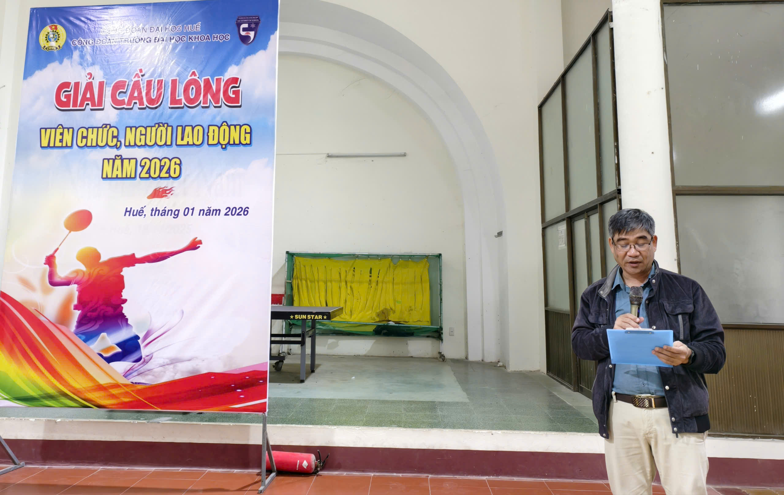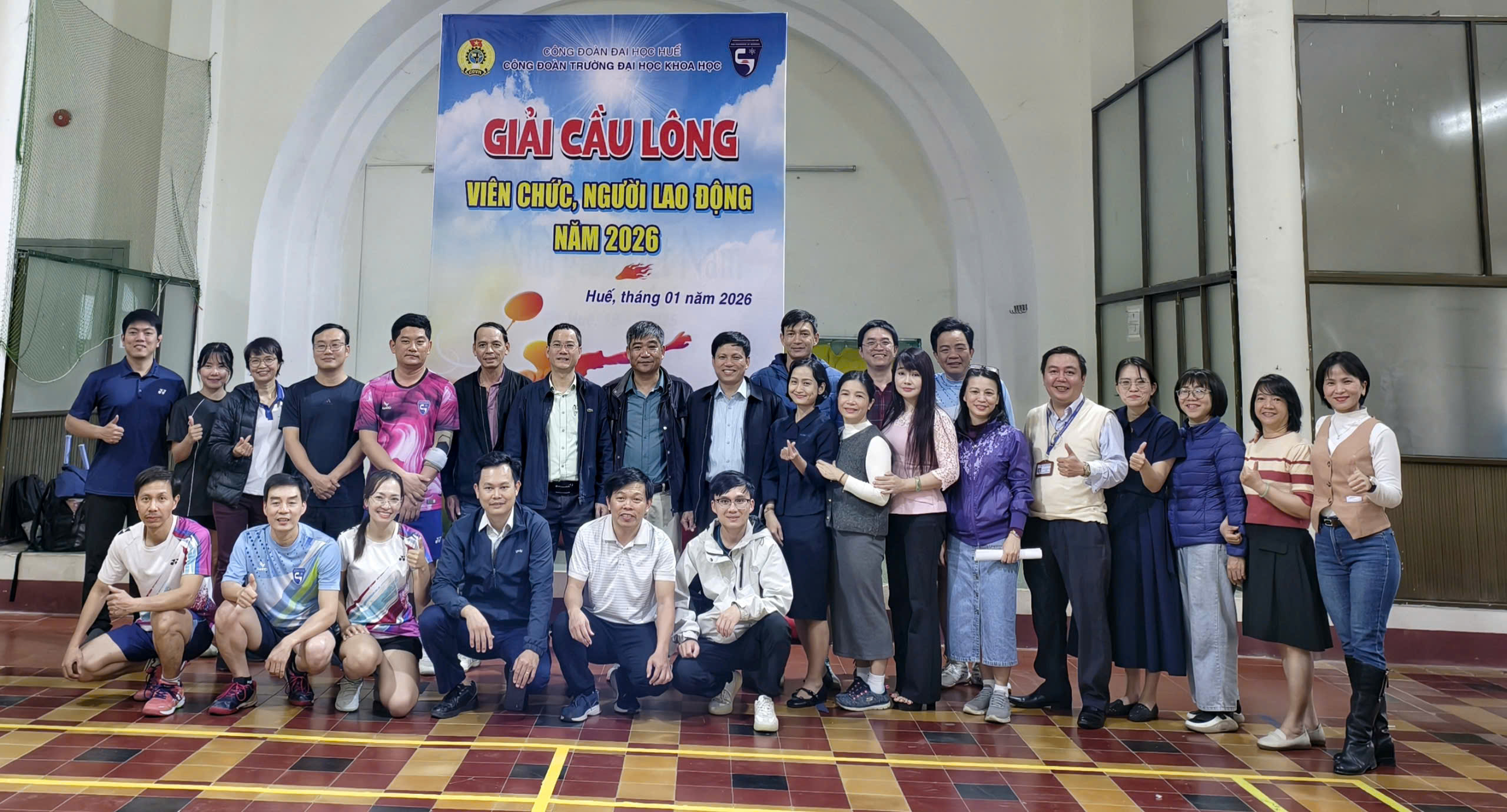Chiều ngày 27/01/2026 tại Hội trường A2 của Trường Đại học Khoa học đã diễn ra Lễ khai mạc Giải Cầu lông viên chức, người lao động năm 2026 do Công đoàn cơ sở Trường Đại học Khoa học, Đại học Huế tổ chức. Giải đấu được tổ chức trong 02 ngày 27 và 28/01/2026 với sự tham gia của 2 đội cầu lông và các hạn mục cá nhân.