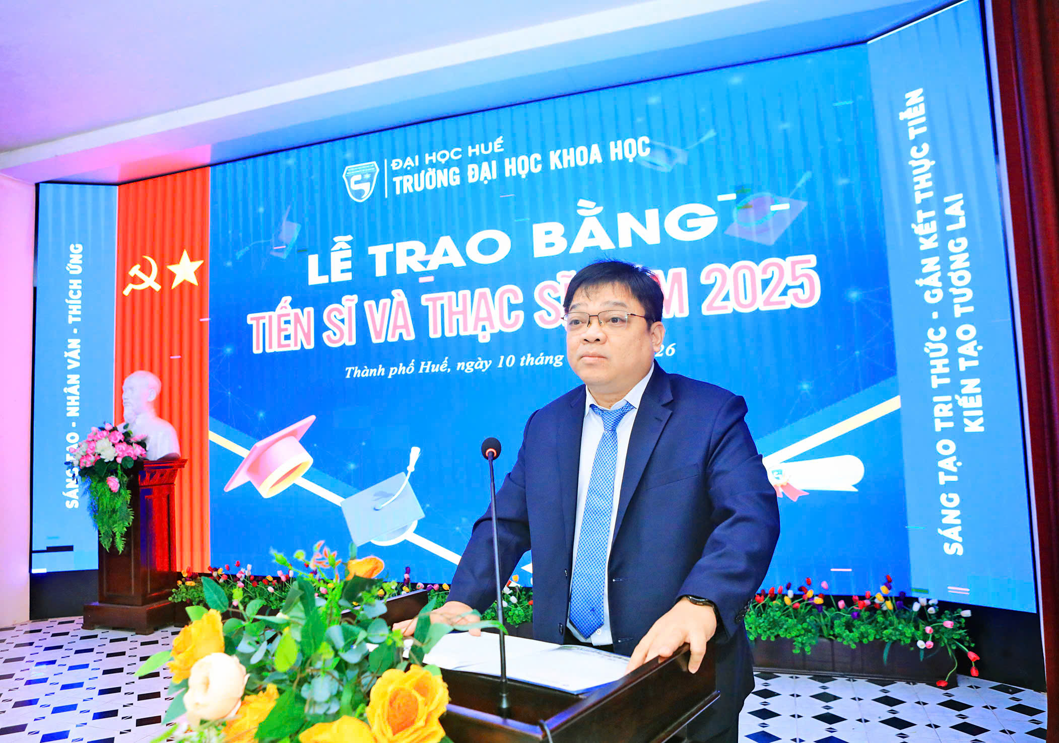 Sáng ngày 10/01/2026, Trường Đại học Khoa học, Đại học Huế đã long trọng tổ chức Lễ trao bằng tiến sĩ và thạc sĩ cho các nghiên cứu sinh, học viên cao học hoàn thành chương trình đào tạo năm 2025.