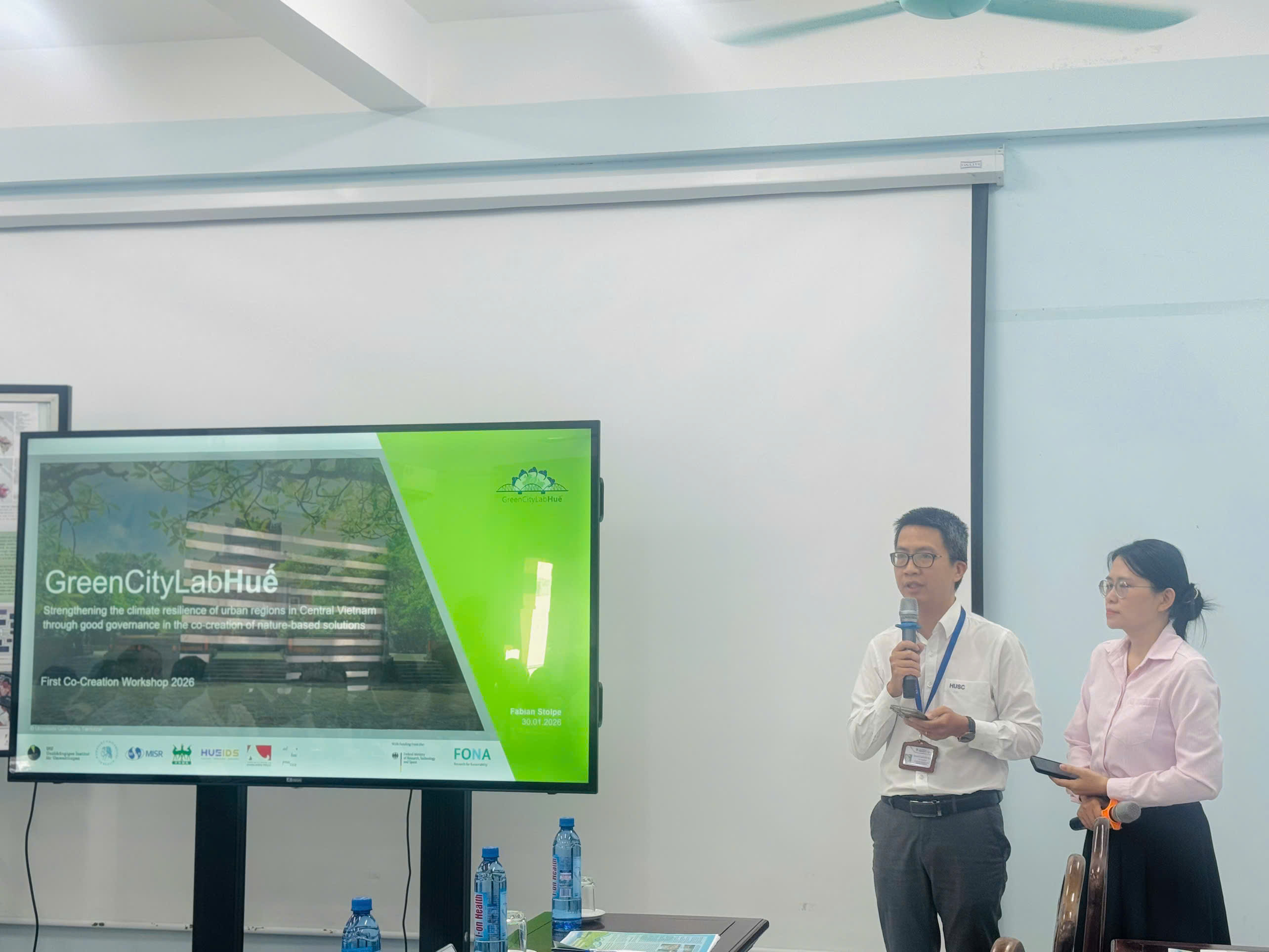 Sáng ngày 30/01, trong khuôn khổ chương trình trao đổi học thuật về đồng sáng tạo các giải pháp dựa vào thiên nhiên (Nature-based Solutions – NbS) thuộc Dự án GreenCityLab Huế, Trường Đại học Khoa học, Đại học Huế đã tổ chức buổi làm việc và workshop với sự tham gia của ông Fabian, Điều phối Dự án Hạ tầng xanh, cùng các nhà khoa học, cán bộ, giảng viên, sinh viên và học sinh.