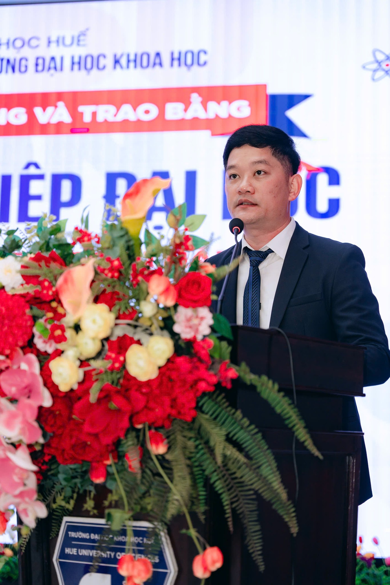Phát biểu tại buổi lễ, TS. Trần Ngọc Tuyền – Phó Hiệu trưởng Nhà trường đã gửi lời chúc mừng đến các tân cử nhân, kỹ sư và kiến trúc sư; đồng thời bày tỏ niềm tự hào đối với những thế hệ sinh viên đã trưởng thành từ Trường Đại học Khoa học – Đại học Huế. Thầy nhấn mạnh rằng tấm bằng tốt nghiệp hôm nay không phải là điểm kết thúc mà là khởi đầu cho một hành trình mới, nơi mỗi người cần tiếp tục học hỏi, thích nghi và phát huy năng lực của mình trước những thay đổi nhanh chóng của xã hội.