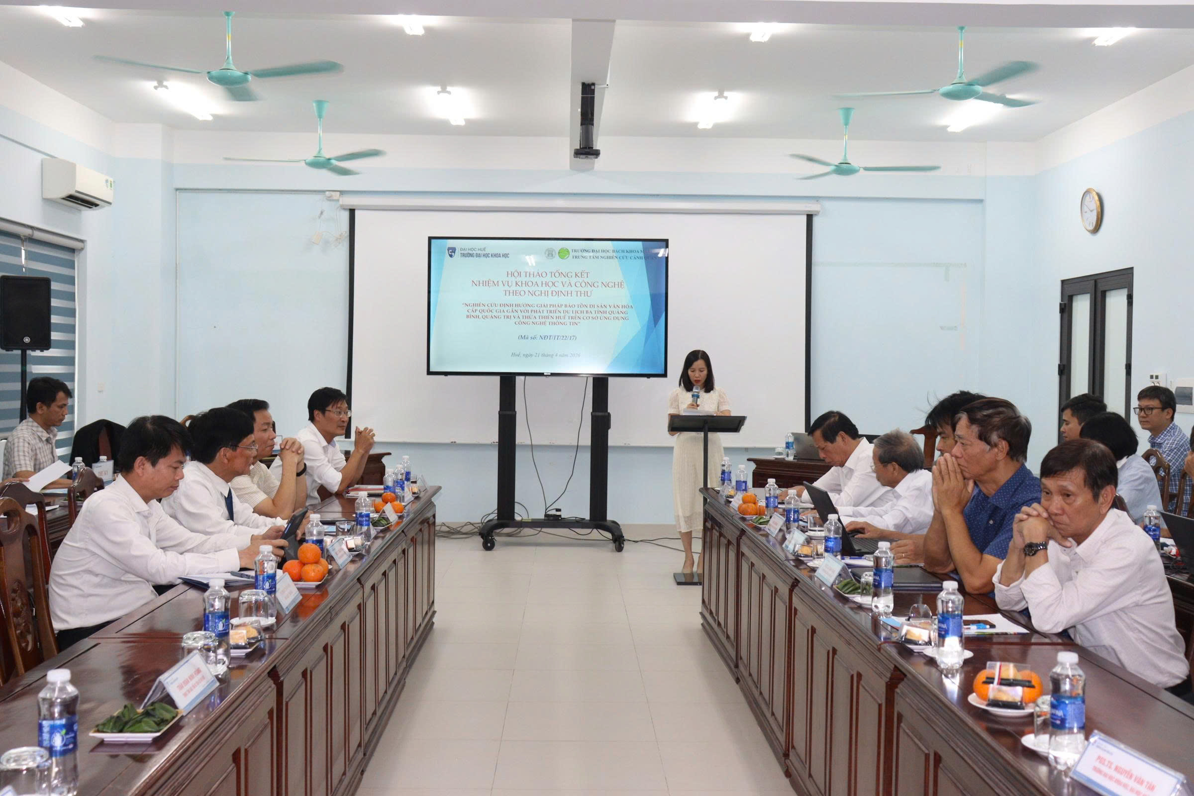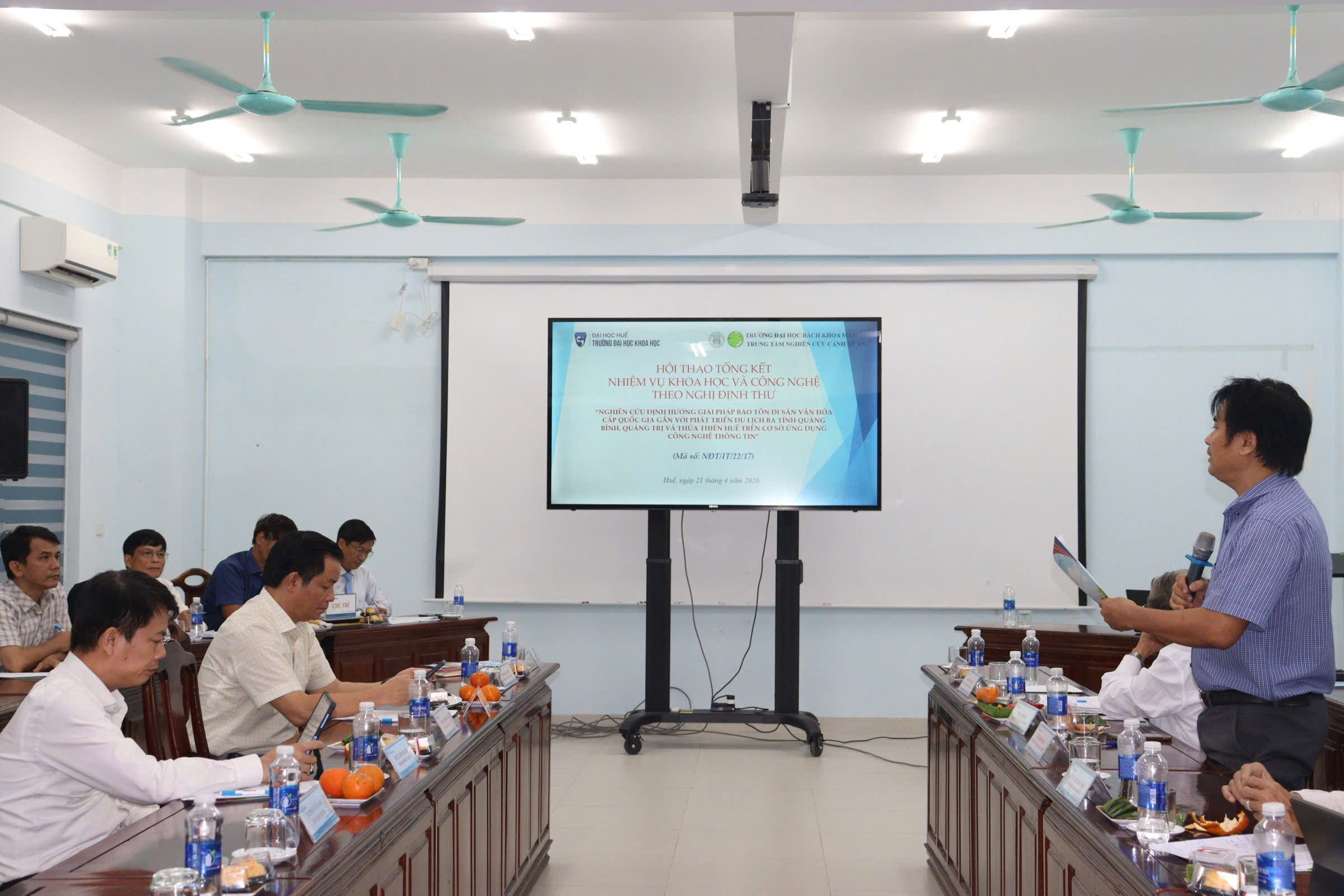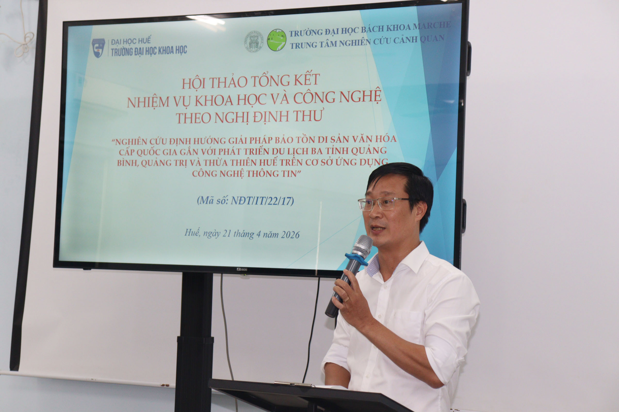 Từ 14 giờ 30 phút ngày 21/4/2026,  Trường Đại học Khoa học, Đại học Huế tổ chức Hội thảo Tổng kết Nhiệm vụ Khoa học và Công nghệ theo Nghị định thư “Nghiên cứu định hướng giải pháp bảo tồn di sản văn hóa cấp quốc gia gắn với phát triển du lịch ba tỉnh Quảng Bình, Quảng Trị và Thừa Thiên Huế trên cơ sở ứng dụng công nghệ thông tin” (The research of orientated solutions to preserve national cultural heritage associated with tourism development in Quang Binh, Quang Tri and Thua Thien Hue Provinces on the basic of information technology application) tại Khu vực nhà D - 77 Nguyễn Huệ, thành phố Huế, Trường. Hội thảo nằm trong khuôn khổ Nhiệm vụ Khoa học và Công nghệ theo Nghị định thư, Mã số NĐT/IT/22/17 hợp tác giữa Việt Nam và Italy do PGS.TS. Hoàng Văn Hiển làm Chủ nhiệm và Trường Đại học Khoa học là cơ quan chủ trì.